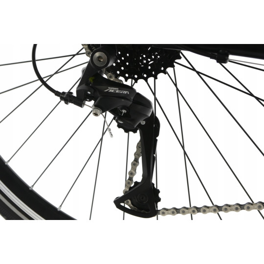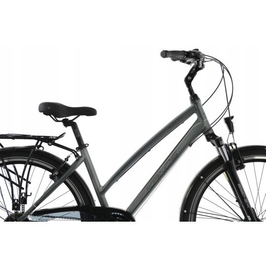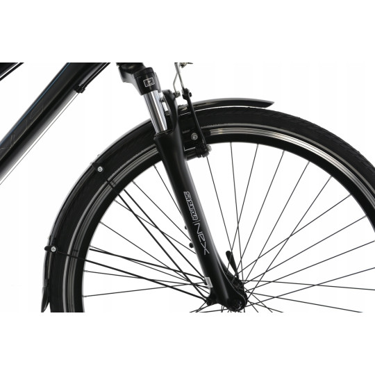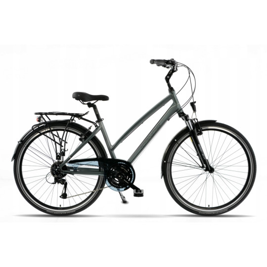 Rowery ,,Trekkingowe,, na kołach 28” , to modele ,,wszystko mające,, . Wyróżniają się pod względem praktyczności dzięki zastosowaniu dodatków takich jak błotniki, bagażniki, osłony, amortyzatory przednie, sztyce amortyzowane, solidne podpórki , regulowane mostki oraz nowoczesne lampy. Idealnie nadają się do jazdy po miejskich ścieżkach rowerowych jak i na długie wypady poza miasto. Mocne koła na solidnych, wzmacnianych, aluminiowych obręczach pozwolą pokonywać nawet najtrudniejsze szlaki wraz z ładunkiem. Odpowiednio dobrane opony zapewniają idealną przyczepność w terenie oraz na twardej nawierzchni. Dostępność w wersjach damskich i męskich w różnych rozmiarach ram pozwoli na optymalne dopasowanie oraz wspólne przejażdżki w parach lub rodzinnie . Lekkie aluminiowe komponenty, zastosowane profesjonalne trekkingowe napędy shimano oraz doskonały montaż całości sprawiają, że rower prowadzi się stabilnie a jeżeli sytuacja wymaga można zwiększyć dynamikę jazdy. Zastosowanie odpowiedniej geometrii ram, pozwala na przeniesienie części swojego ciężaru na przód roweru co umożliwia optymalne wykorzystanie siły i kondycji swojego ciała nawet na kilkuset kilometrowych wycieczkach. Kilka wersji osprzętu pozwala na dopasowanie komponentów technicznych do swoich potrzeb.