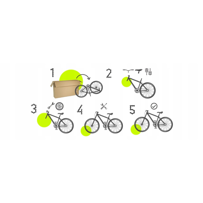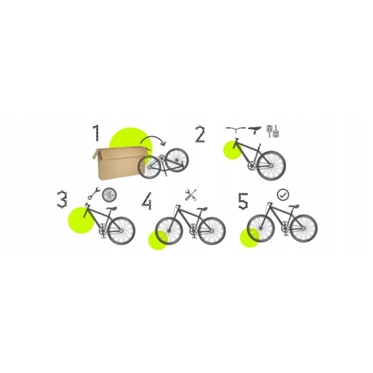 Do samodzielnego montażu pozostaje przykręcenie: siodełka, pedała prawe (R) i lewe (L), przednie koło oraz kierownica. Przed wysłaniem rower jest starannie regulowany i skręcany a następnie pakowany w kartonowe pudło i solidnie zabezpieczony przed uszkodzeniem.